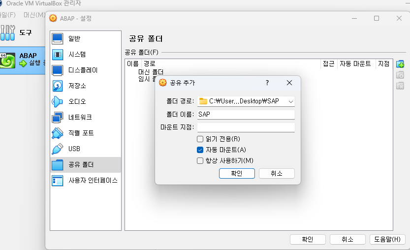 - 위 화면이 나타나면 이제 공유폴더를 설정해야 한다.