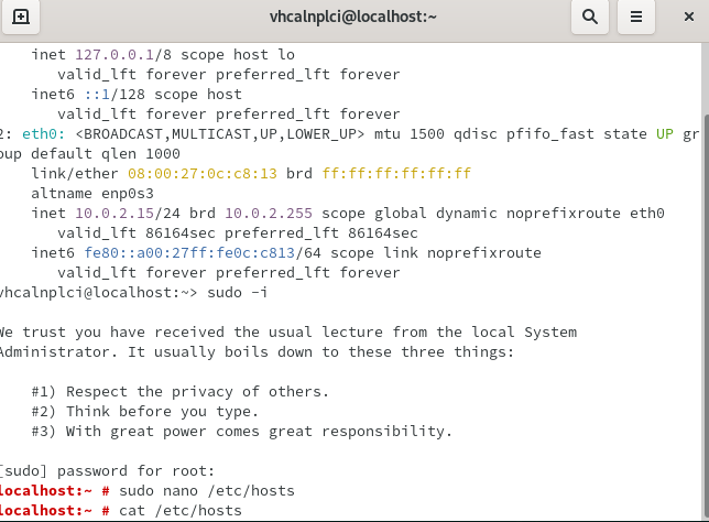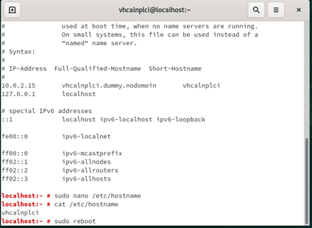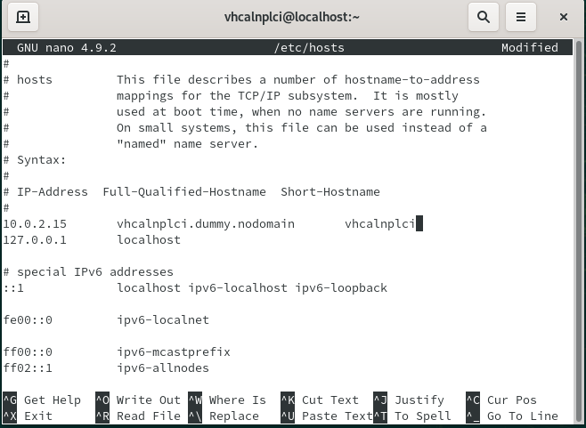 - "10.0.2.15 (TAB) vhcalnplci.dummy.nodomain (TAB) vhcalnplci"를 입력한다. (TAB)은 키보드 TAB을 누른다.